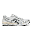 Der Asics Gel-Kayano 14 in einem neuen Colorway: Mit dabei sind ein Low-Cut, der typische Kayano 14 Shape, ein Mix aus weißem, luftigem Mesh und silberfarbenen, stabilisierenden Overlays sowie eine teils beigefarbene Midsole. Für Komfort sorgen bequeme Polsterungen am Schuhkragen und an der Zunge sowie eine Sohle mit Asics Gel-Dämpfung.
